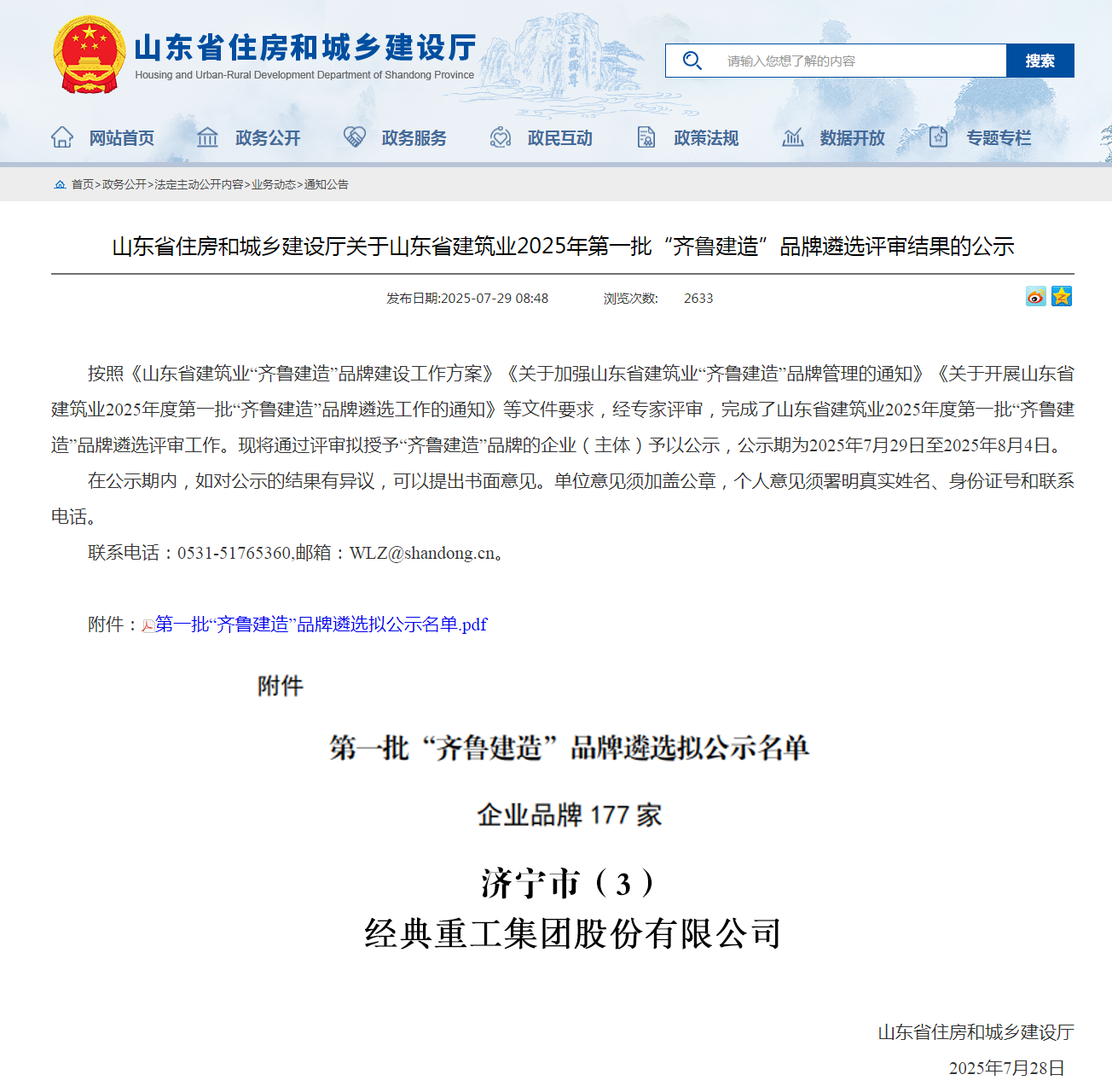 近日,山東省住房和城鄉(xiāng)建設(shè)廳正式公布2025年第一批“齊魯建造”品牌遴選名單,經(jīng)典重工集團(tuán)股份有限公司憑借在鋼結(jié)構(gòu)建筑部品建材領(lǐng)域的技術(shù)實力與品牌影響力,成功入選部品建材品牌名錄,這標(biāo)志著公司在推動建筑產(chǎn)業(yè)現(xiàn)代化、智能化、綠色化發(fā)展方面的綜合實力又獲省級權(quán)威認(rèn)可。2025-08-06 -
